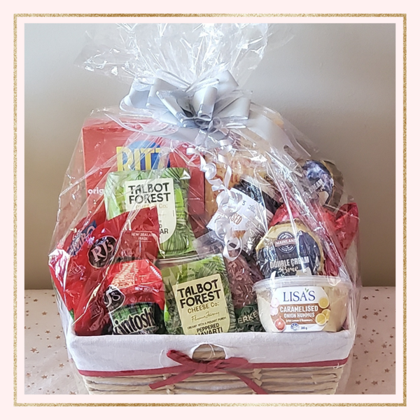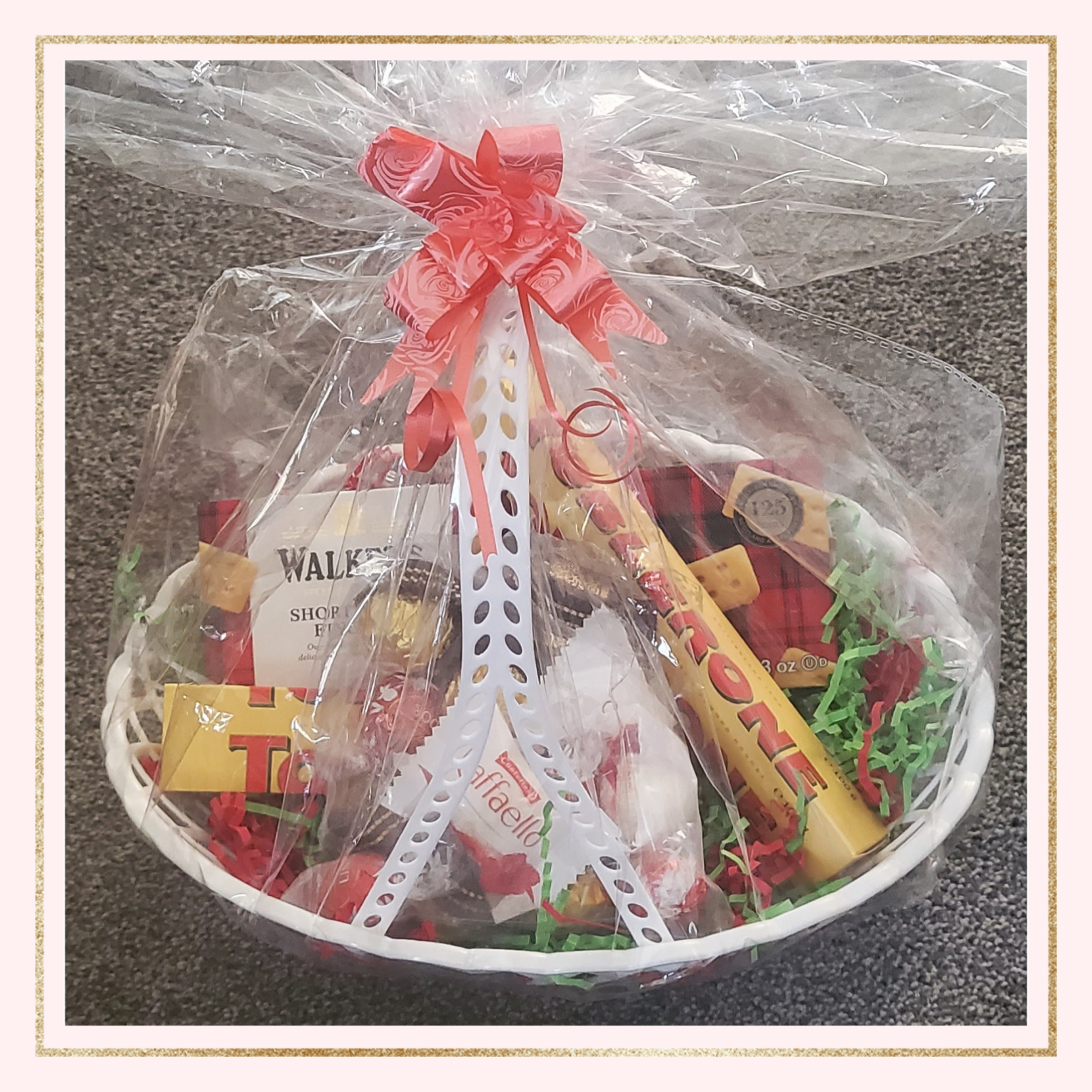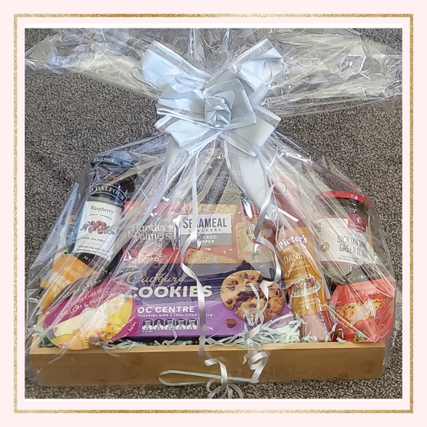 will be presented either in a basket or on a tray with cellophane and a bow to complete the gift